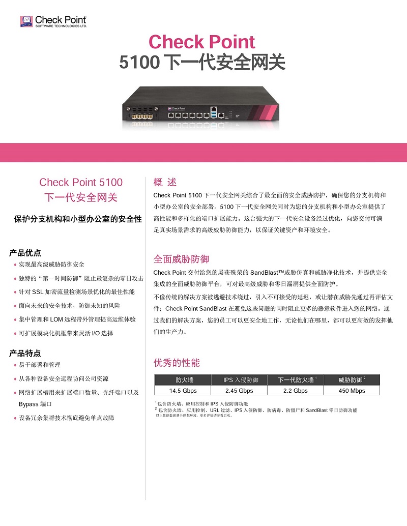 Check Point 5100下一代安全網(wǎng)關(guān)綜合了最全面的安全威脅防護(hù),確保您的分支機(jī)構(gòu)和小型辦公室的安全部署。5100下一代安全網(wǎng)關(guān)同時(shí)為您的分支機(jī)構(gòu)和小型辦公室提供了高性能和多樣化的端口擴(kuò)展能力。這臺(tái)強(qiáng)大的下一代安全設(shè)備經(jīng)過優(yōu)化,向您交付可滿足真實(shí)場(chǎng)景需求的高級(jí)威脅防御能力,以保證關(guān)鍵資產(chǎn)和環(huán)境安全。