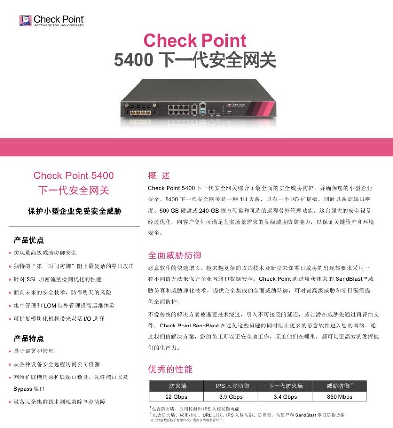 Check Point 5400下一代安全網(wǎng)關(guān)綜合了最全面的安全威脅防護(hù),并確保您的小型企業(yè)安全。5400下一代安全網(wǎng)關(guān)是一種1U設(shè)備,具有一個(gè)I/O擴(kuò)展槽,同時(shí)具備高端口密度、500 GB硬盤或240 GB固態(tài)硬盤和可選的遠(yuǎn)程帶外管理功能。這臺(tái)強(qiáng)大的安全設(shè)備經(jīng)過優(yōu)化,向客戶交付可滿足真實(shí)場景需求的高級威脅防御能力,以保證關(guān)鍵資產(chǎn)和環(huán)境安全。