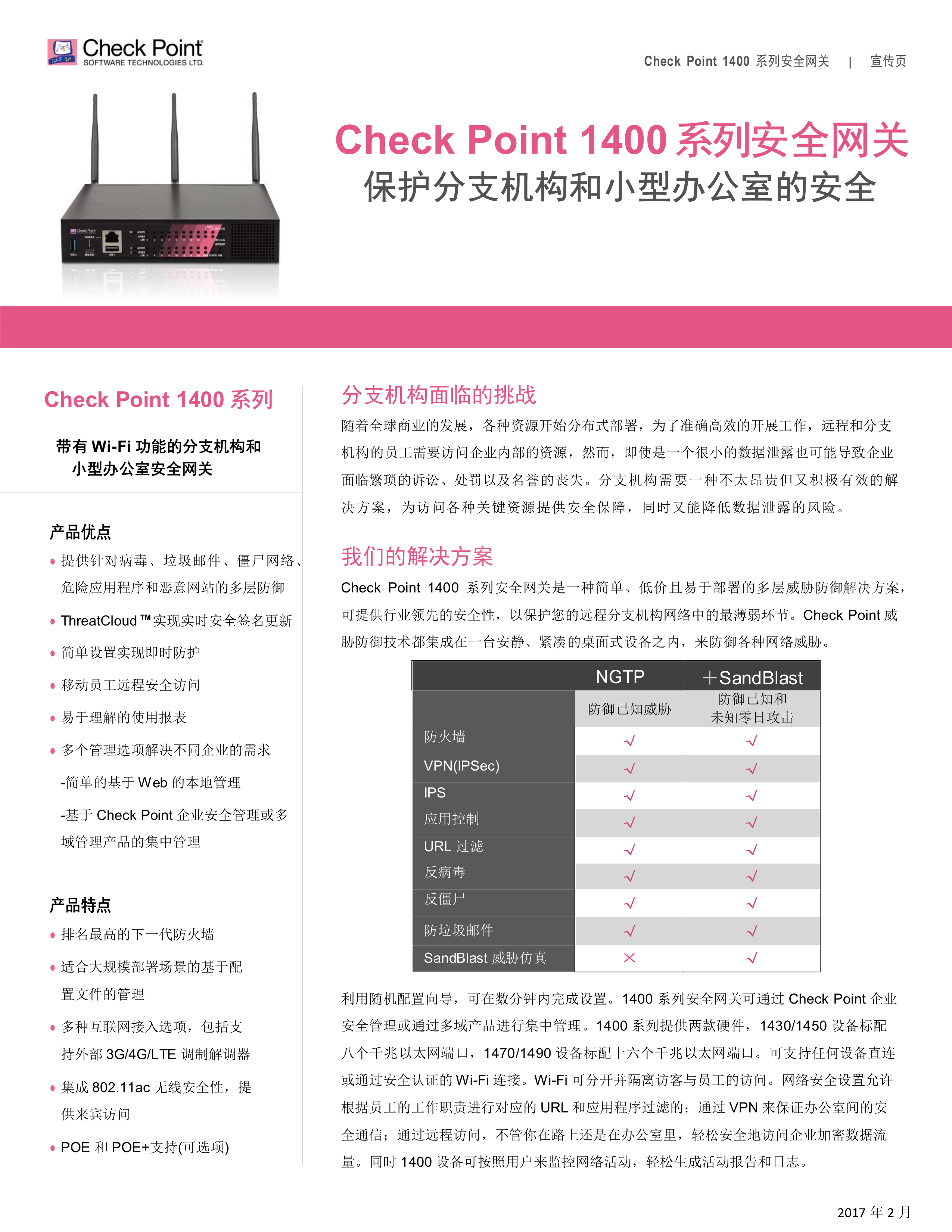 Check Point 1400 系列安全網(wǎng)關(guān)是一種簡單、低價且易于部署的多層威脅防御解決方案, 可提供行業(yè)領(lǐng)先的安全性,以保護您的遠程分支機構(gòu)網(wǎng)絡(luò)中的最薄弱環(huán)節(jié)。Check Point 威 脅防御技術(shù)都集成在一臺安靜、緊湊的桌面式設(shè)備之內(nèi),來防御各種網(wǎng)絡(luò)威脅。
